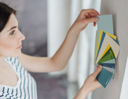 person using phone and looking at color swatches at a table